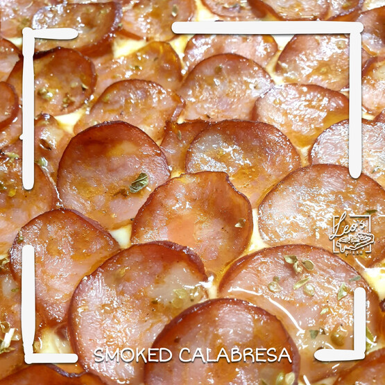 Pizza sauce, mozzarella cheese, seasoned shredded chicken breast, bacon, Leo's aioli mayo, oregano