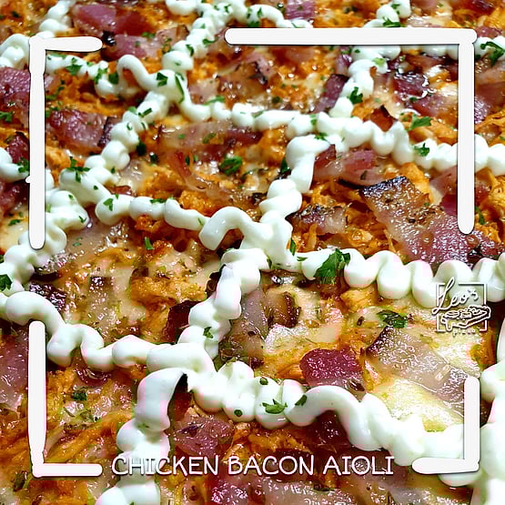 Pizza sauce, mozzarella cheese, seasoned shredded chicken breast, bacon, Leo's aioli mayo, oregano